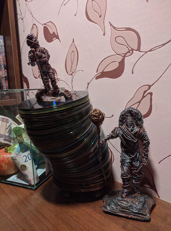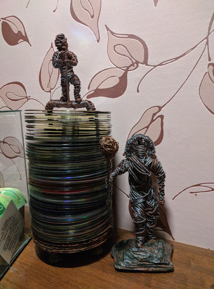потом, решив собрать старые диски в лампу захотелось мне на верхушку посадить что-то из проволоки . Изначально планировалась зарисовка по ЗВ, но обе заготовки оказались великоваты, распускать было жалко и с 3 попытки получился рыцарь. Лента для лампы до меня никак не доедет, но я все же не выдержала и собрала намертво конструкцию...