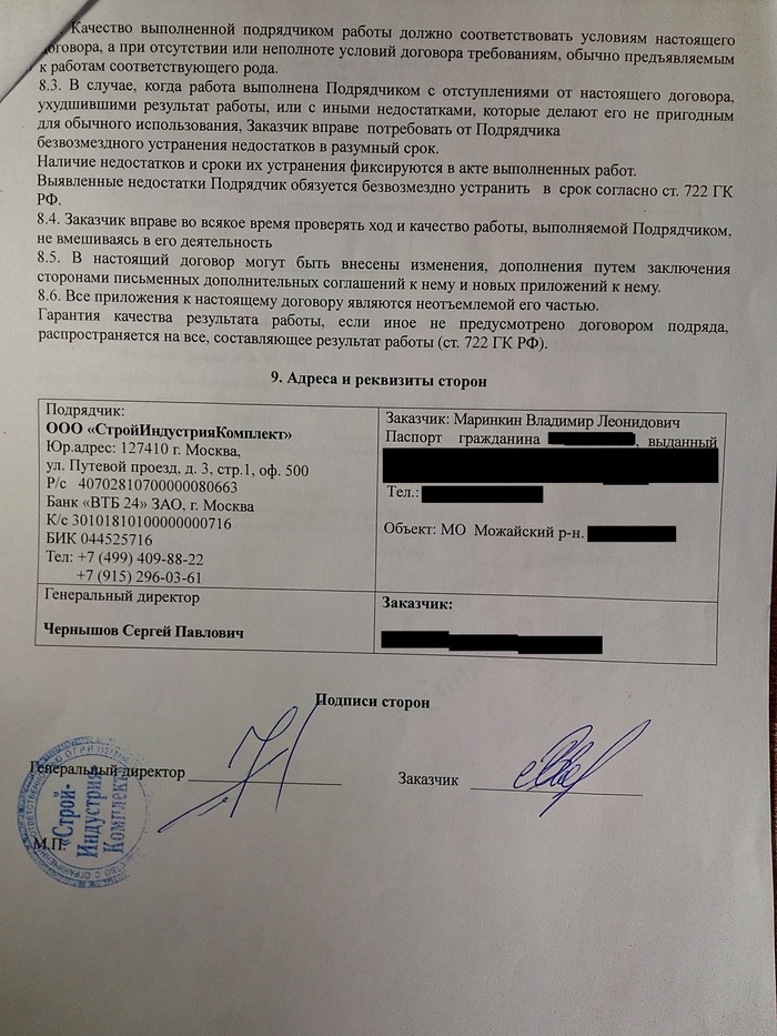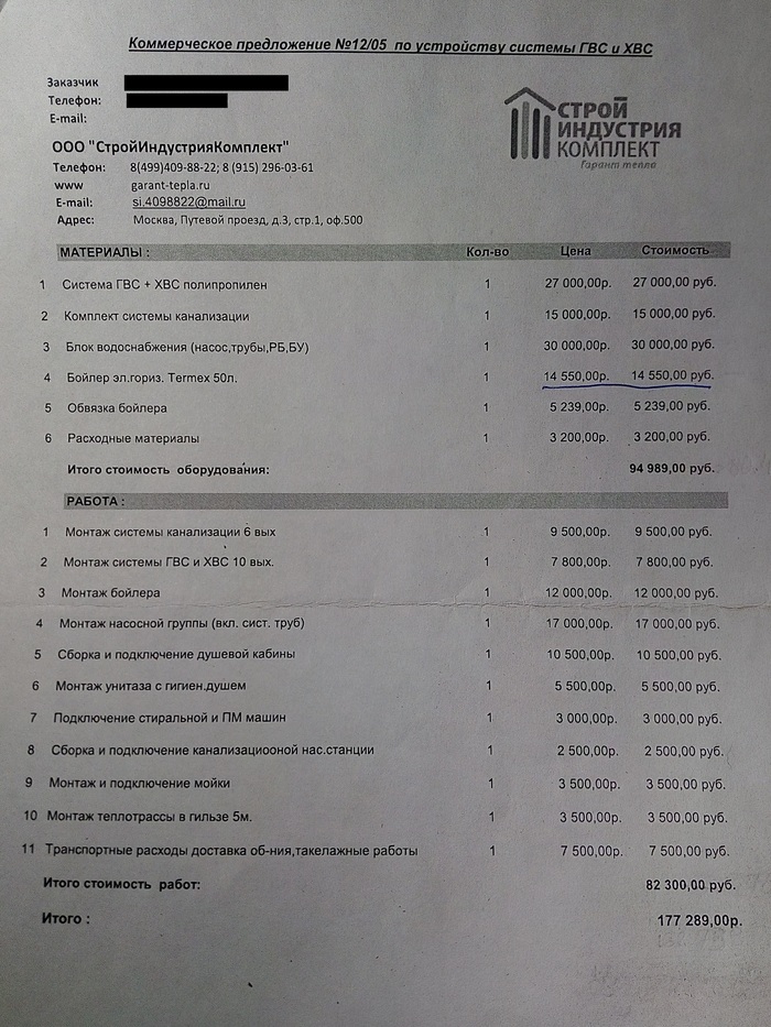 Вложили во всё это долго накопленные ~177k, ожидалось, что вот теперь-то можно будет забыть о вечных накоплениях для деревни, постоянных мечтаний о несколько более лучшей (во всех смыслах) жизни в области, а не в Москве. Когда работы были завершены соответственно хочется попробовать на себе сделанное и что они сделали за такую немалую сумму? А сделали они: ужасное горячей и холодное водоснабжение, не вывели уличные краны (2шт.), не установлен сани насос, из-за неправильной установки душевой кабины там нету нормального слива, в добавок эта душевая кабина ещё и протекает, сгорел подающий скважинный насос. При установке котловой отопительной системы дымоход котла они своим ГЕНИАЛЬНЫМ главным органом ЦНС (своим мозгом) додумались делать через несущую стеновую балку второго этажа. На первом этаже, на кухне, разорвали бельгийский линолеум, оторвали уголки пластикового плинтуса, розетки не возвращены на место. В коммерческом предложении было указано два насоса, а установили один насос. Бак гидроаккумулятора гидросистемы отопления стоит ниже уровня котла и при разрыве мембраны отопления отключается до замены мембраны, если выше уровня котла, то даже с разорванной мембраной система отопления может продолжат работать.