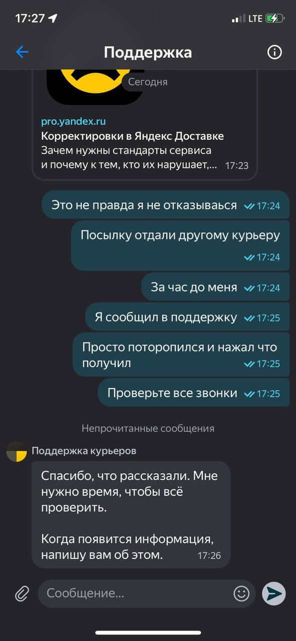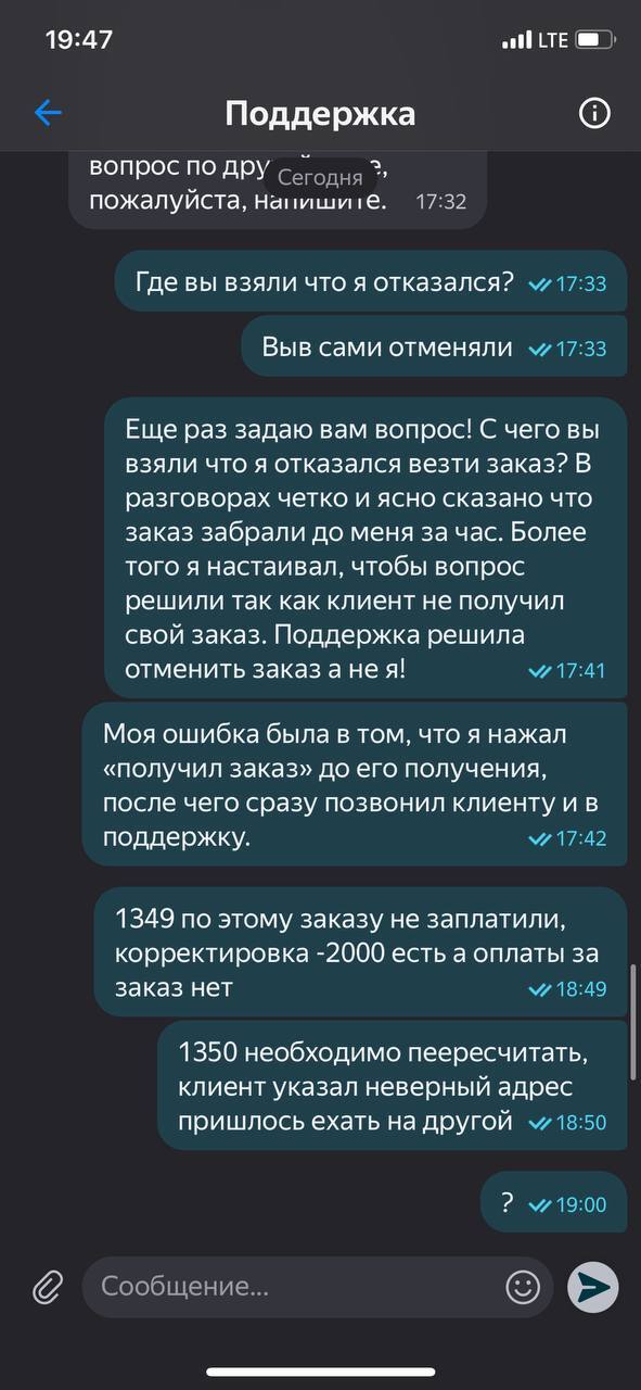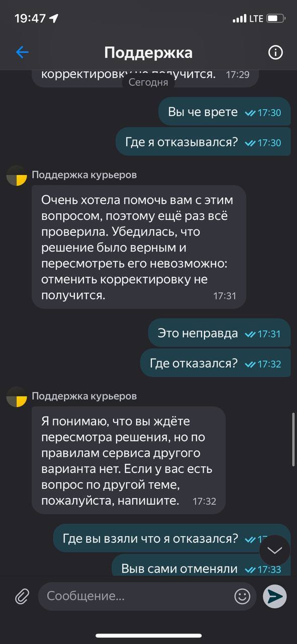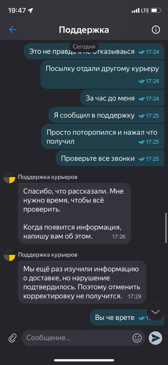 Мне заявили, что я «отказался выполнять заказ, который получил». Я трижды просил операторов перепроверить ситуацию и прослушать записи разговоров - у них был доступ к трём моим беседам с поддержкой и звонку с клиентом. Каждый раз приходил формальный ответ: «Нарушение правил сервиса подтвердилось».