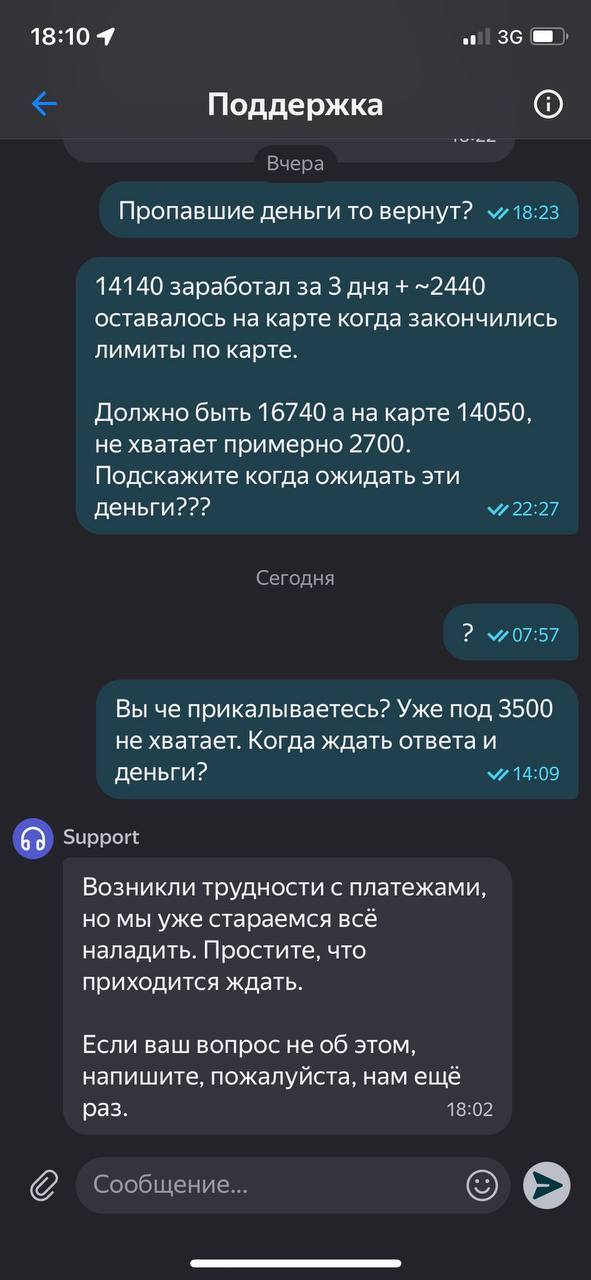 Обращения в поддержку первые дни игнорировались. Затем, на третий день, компания признала наличие «технической ошибки». Последующие почти две недели, вплоть до 10 ноября, стандартным ответом была отписка: «Разработчики уже в курсе проблемы и работают над её решением». Деньги за недоплаты так и не были возвращены. Фактически, Яндекс в открытую признавал, что пользуется своими средствами, не собираясь их возвращать. На тот момент общая сумма недоплат составила более 3700 рублей.