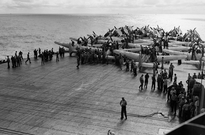 Пикирующие бомбардировщики SBD-5 «Донтлесс» (Douglas SBD-5 Dauntless) 16-й бомбардировочной эскадрильи (VB-16) на полетной палубе авианосца «Лексингтон» (USS Lexington, CV-16). 1943 — 1944 гг.