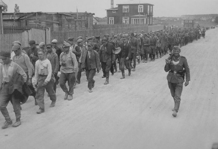 В колонне находятся также мужчины в гражданской одежде. Военная униформа на пленных преобладает только с середины колонны. Военнообязанных, направлявшихся по мобпредписаниям в свои части, как и всех лиц мужского пола призывного возраста, немцы тоже брали в плен.