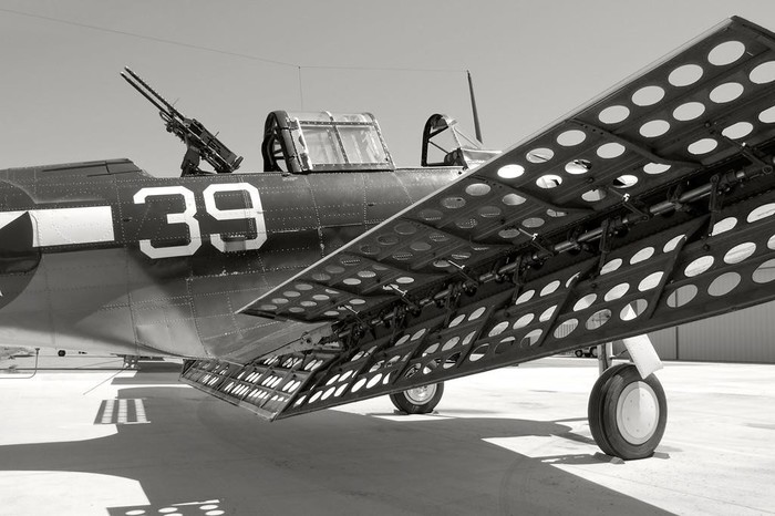 На фото хорошо видны большие щитки, которые занимали значительную часть задней кромки крыла. Они были разделены на две половины, открывающиеся вверх и вниз, действуя как тормоза при пикировании. При заходе на посадку нижние половины действовали как обычные щитки-закрылки. Секции закрылков перфорировались отверстиями диаметром 44-мм для устранения бафтинга (тряски) оперения.
