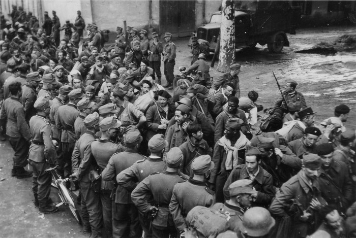 Пленные французские солдаты проходят вдоль шеренги немецких солдат. 1940 год.