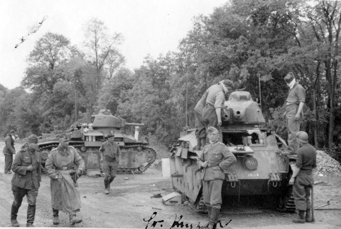 Французские танкисты это люди на танке, а также человек справа в шлеме. На лицах платки для защиты от запаха разложения. Немцы часто использовали для таких «грязных» работ пленных. Танки на снимке — французские средние танки Char D2.