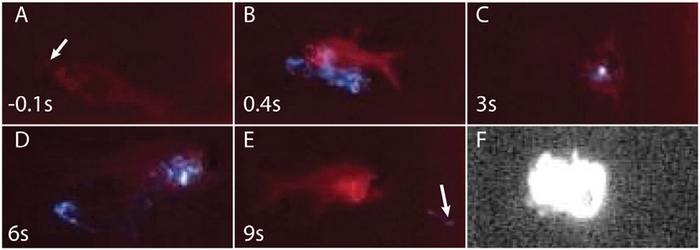 Рыба Phaeoptyx pigmentaria из семейства апогоновые пытается съесть рачка Photeros annecohenae. A–E — кадры из видео, сделанного при тусклом красном источнике света. Стрелочка указывает на двухмиллиметрового рачка. A — кадр за 0,1 секунды до атаки. B — во рту рыбы рачок начинает испускать большое количество света, рыба выбрасывает светящееся облако химикалий через жабры. C — свет виден и в ротовой полости рыбы. D — выкачивание светящегося секрета из жабр продолжается. E — рыба выплюнула рачка и он поплыл дальше, оставляя за собой светящийся шлейф. F — фото без внешнего источника света, рыба находится в центре светового пятна. Изображение из статьи T. J. Rivers, J. G. Morin, 2012. The relative cost of using luminescence for sex and defense: light budgets in cypridinid ostracods