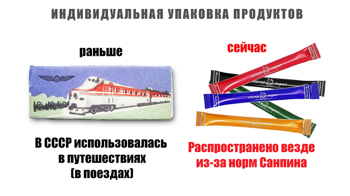 Индивидуальная упаковка продуктов это современная норма. В то же время, она была изобретена для путешествий или общественных мест. Сахар в палочках прочно вошел в нашу жизнь в любом кафе, ресторане и поезде. А ведь это тот-же кусочек сахара в обёртке, по сути, что и в СССР. Конфеты, например, давно уже обзавелись индивидуальной упаковкой - а наши бабушки покупали их только на развес.