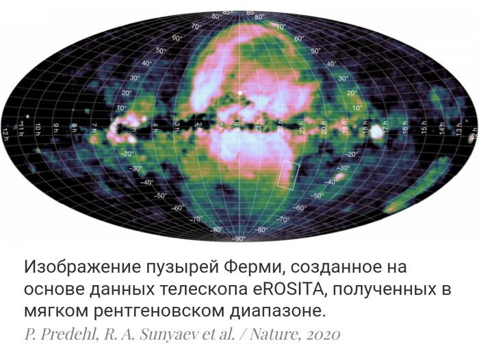Ученые из России, Германии и Италии во главе с Рашидом Сюняевым (R. A. Sunyaev) из Института космических исследований Российской академии наук и Питером Пределем (Peter Predehl) из Института внеземной физики Общества Макса Планка опубликовали результаты анализа наблюдений за пузырями Ферми рентгеновским телескопом eROSITA, установленным на борту космической обсерватории «Спектр-РГ». Целью работы была оценка свойств этих гигантских структур и определение их происхождения.