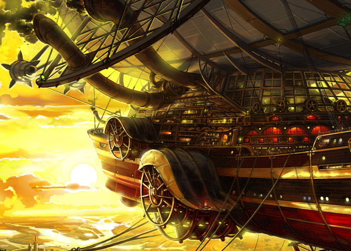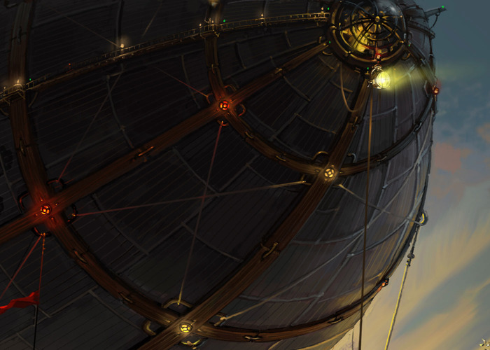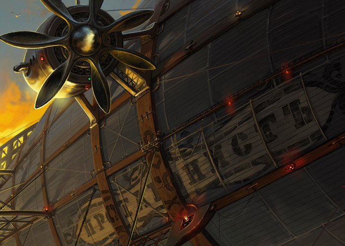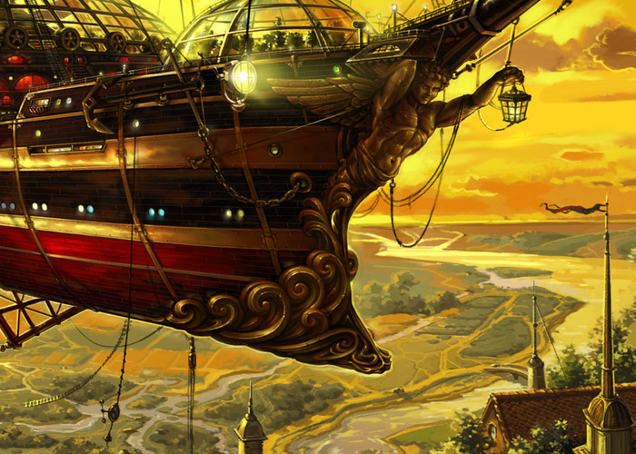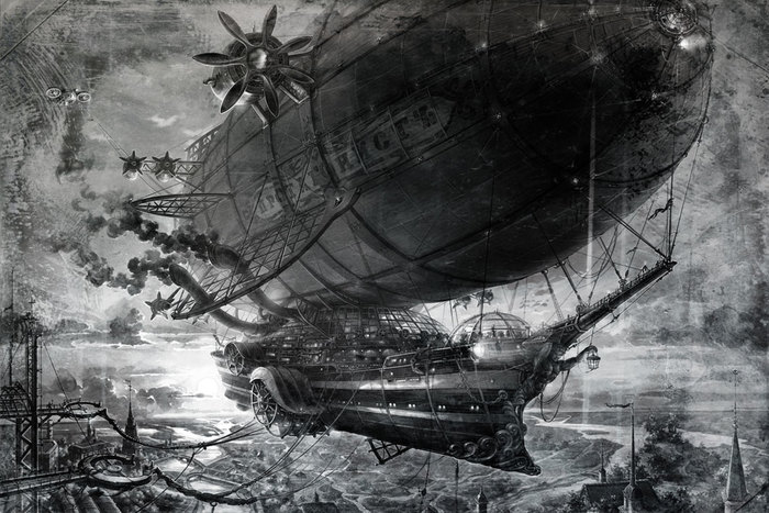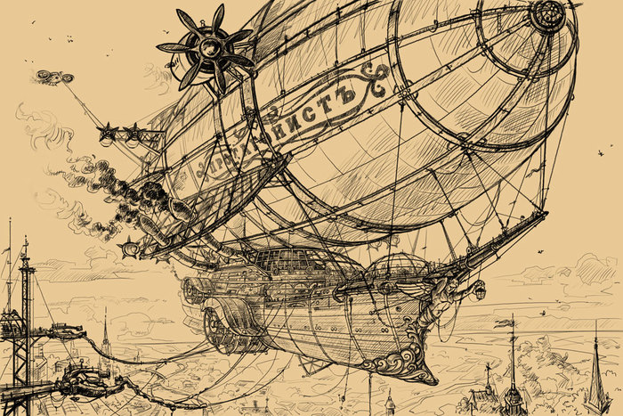 Следующая моя работа, выполненная в жанре « стимпанк», была сделана на заказ для интернет- проекта, с последующим использованием её в оформлении интерьера клуба. Размер работы не маленький – примерно, 3 х 5 метра. В качестве технического задания, мне был предоставлен художественный текст, с описанием воздушного судна под названием «Протагонист». К сожалению, всех тонкостей описания я уже не помню... Там было что-то про гигантский летающий корабль, перевозивший местную элиту по воздуху, с целью предотвращения случайных встреч с местными маргиналами, жившими на земле.