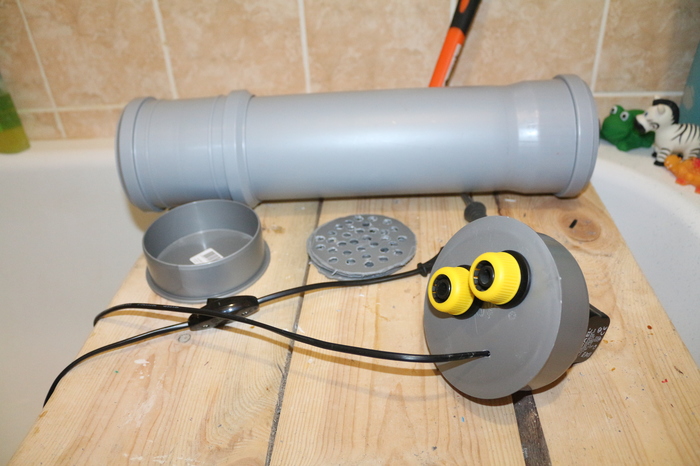 Собираться будет из "подручного" и дешевого материала - канализационные трубы с муфтой и заглушками (корпус), поливочные шланги, соединительные муфты, санитарный силиконовый герметик и помпа.