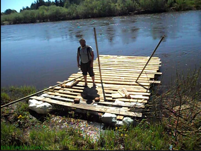 Немного расскажу о конструкции плота, она самая примитивная, - три ряда по 9 мешков с бутылками привязаны к продольным доскам, к которым приколочен гвоздями настил из поперечных досок. Вот пара кадров из видео, снятого на следующий день, думаю, там всё понятно.