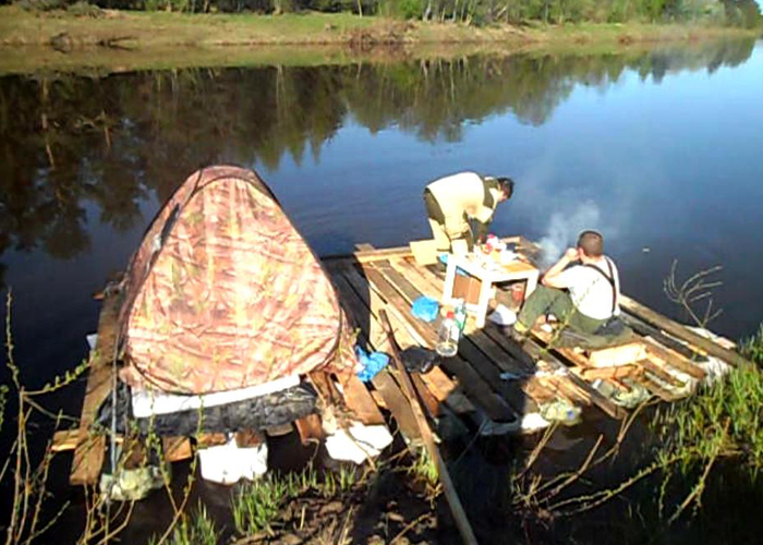 а затем разделиться - одного члена команды оставить делать плот, а остальным найти тракториста с трактором в ближайшей деревне и закупиться в городе продуктами и другими необходимыми вещами. На поиски трактора ушло где-то час-полтора, спасибо знакомым, подсказали телефон, газель вытащили и поехали в город, где всё закупили и нас привезли к берегу на легковом автомобиле. Все эти телодвижения заняли довольно много времени, и на берег мы вернулись уже ближе к 11 вечера, когда начало уже заметно темнеть, так что плот мы заканчивали собирать подсвечивая себе фонариками на мобильных телефонах.