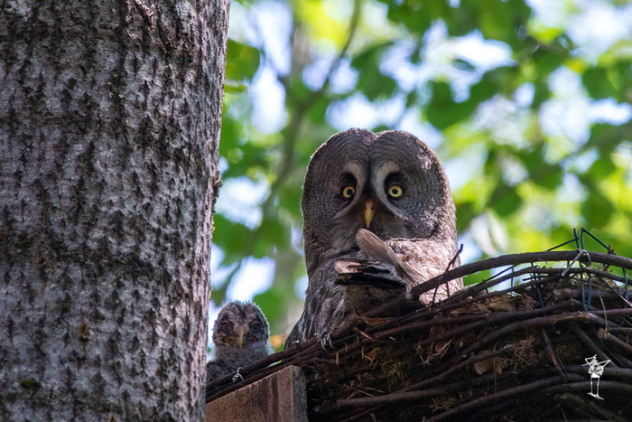 Бородатая неясыть с птенцом.