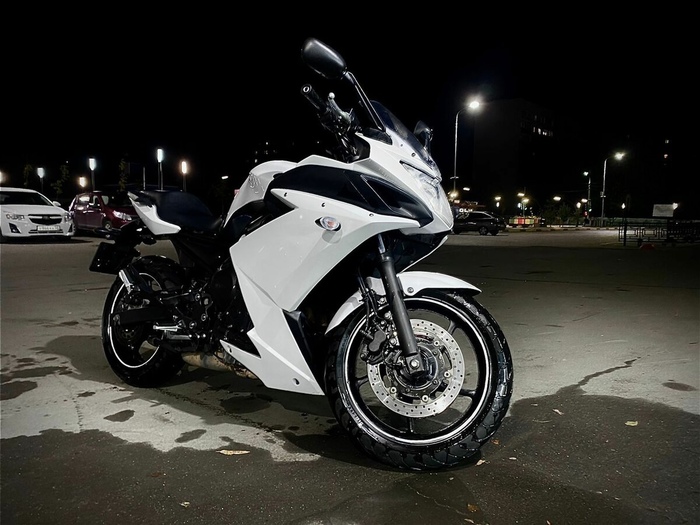 Мотоцикл был приобретен с рук (фото продавца) в начале декабря. Конь, конечно, падал. На фото видно, что отсутствует левый передний поворотник (уже купил пару новых), также диски нуждаются в прокатке, ну и нужно провести общее ТО (есть мнение, что придется поменять цепь ГРМ, но это пока не точно).