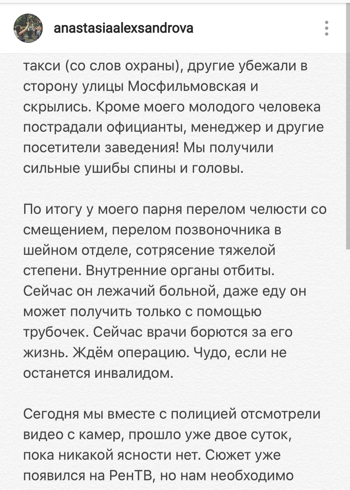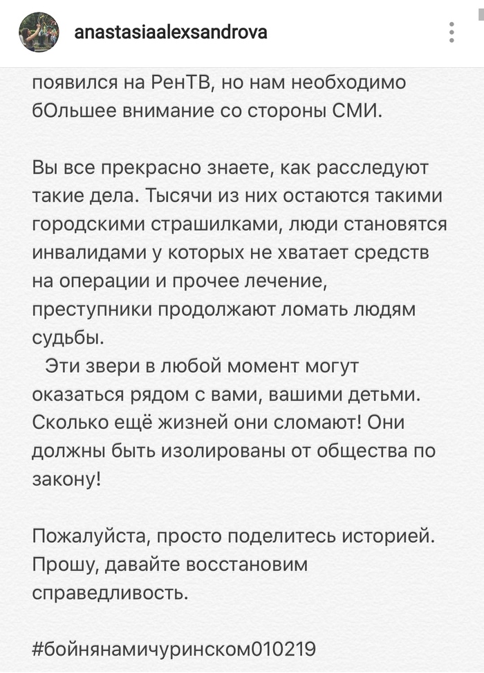 2. Берем пост Анастасии Александровой от 03.02.19: после драки приехало РЕН ТВ, море свидетелей, молодой человек пострадал.... И.... Лицо молодого человека замазано на фото, но о том, что приехало РЕН ТВ упомянуть в посте обязательно надо. Это при том, что фотографий с почти уже женихом в инстаграмме, не хочу , вас, девушки, обидеть.... как-то мало, на самом деле... А проще говоря...их нет.