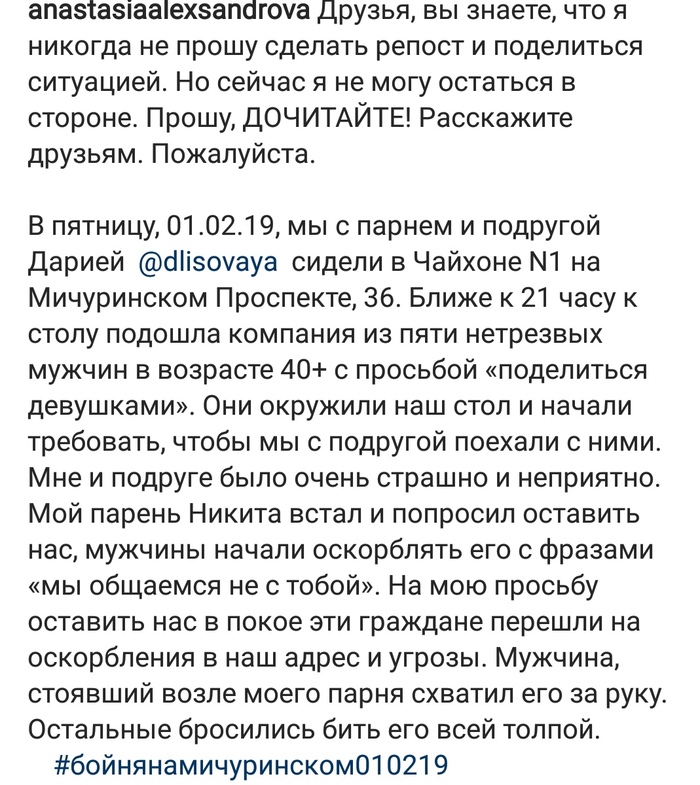2-го февраля в 0:15 на сайте РЕН.ТВ (http://ren.tv/novosti/2019-02-02/ubivali-na-glazah-u-vseh-oc...) появляется новость о драке в "Чайхоне" на Мичуринском проспекте, со слов очевидца. Никаких подробностей, кроме того, что парня избили за то, что он не "поделился" девушками нет особо нет. «его реально убивали на глазах у всех».