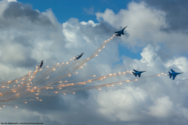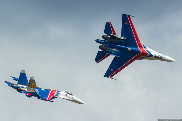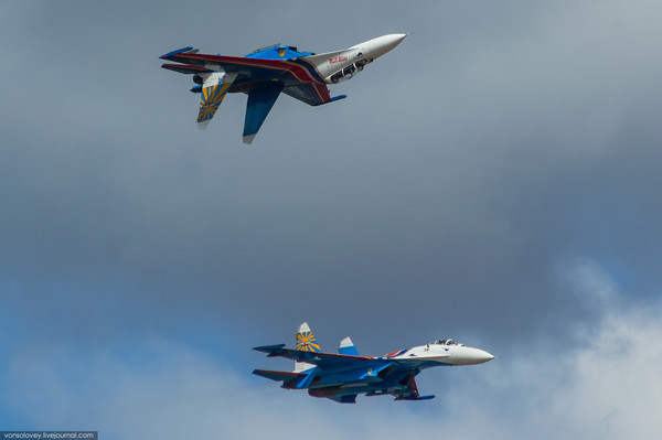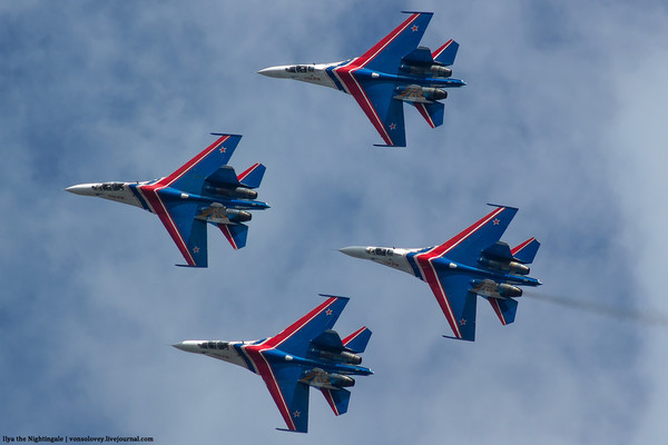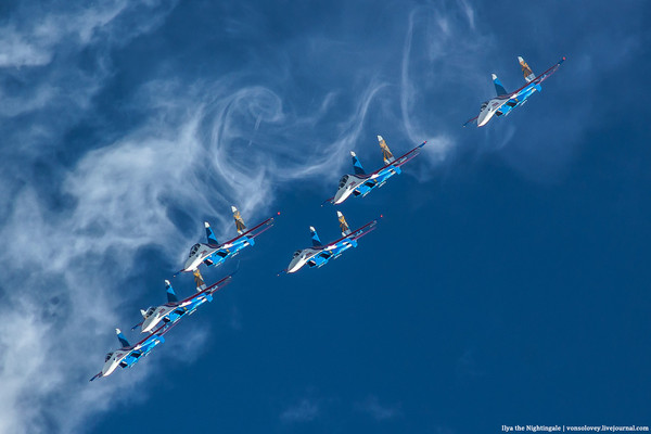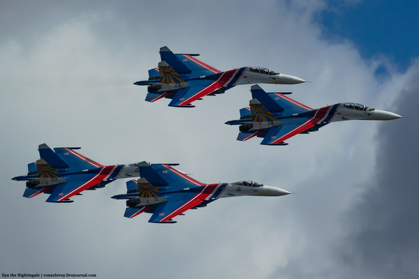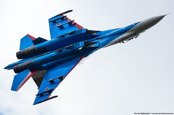 Далее одиночный пилотаж на одноместном Су-27П (гвардии подполковник Олег Ерофеев). Остальная группа ушла в зону ожидания.
