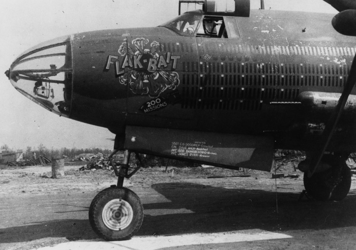Скоростные американские бомбардировщики B-26 Marauder поначалу имели дурную славу из-за ненадёжности, дурацкой центровки и халатности изготовителей, которые недооснащали самолёты и не предоставляли документы для полного освоения машины, но постепенно специалисты из Балтимора допиливали самолёты и сделали нечто удобоваримое. На фото - такой же легендарный именной Мародёр, как B-17 "Красавица мемфиса". Самоиронично названный "Наживкой для флаков", сей аппарат совершил 207 боевых вылетов, в них огрёб порядка 1000 дырок; дважды возвращался на одном двигателе (здесь надо отметить, что у Мародёров была сравнительно высокая скорость сваливания, что делало посадку на одном моторе весьма рискованной), один раз с горящим мотором. Ну и куда уж без типичных поломок для B-26: дважды в полёте отказывала электроника и гидравлика, но всё заканчивалось благополучно. Сейчас самолёт-герой выставлен в Национальном музее авиации и космоса Смитсоновского института.