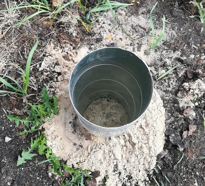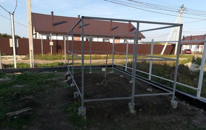Началось все с размеров... 2.5х5 метров, вроде норм. На заднем плане будущий забор. Ну в общем пробурил отверстия, воткнул обрезки вент труб ф150, выставил по уровню...