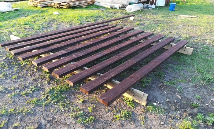 Подготовка досок, брус 150х50 лаги и стропила, покрытие "пинотекс" - палисандр 2 слоя.