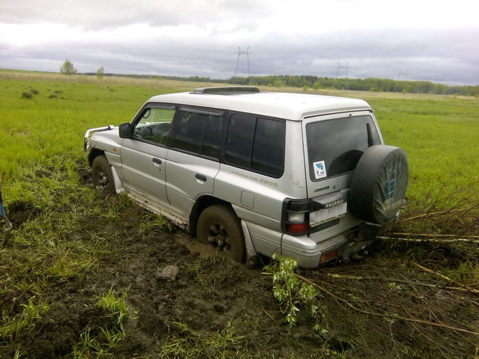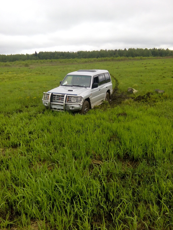 К моей радости Паджерик все так же одиноко стоял и в том состоянии в котором я его оставил. Тракторист прицеп отцеплять не стал, сказав что так будет лучше. Цепанул меня за фаркоп и начал тащить. Русская земля-матушка не так проста как кажется(немцы и французы-то точно знают) и мой Паджерик всосавшись в эту сочную землю даже на сантиметр не сдвинулся, зато Белорус закопался по уши. Думал, что и трактор сядет т.к несколько раз он реально не мог выехать… Пока дергали Паджерика порвали 2 раза трос, стальной трос 20мм(!) не меньше. То ли трос такой убитый то ли хз, что за сила держала машину. Я уже начал отчаиваться и тут решили на последок дернуть за морду(до этого тянули назад логично полагая, что тянуть надо туда где суше) т.е в более сырое и раскисшее место. И, о чудо, со второго раза все поддалось и поехало.