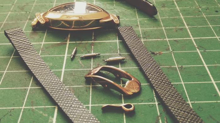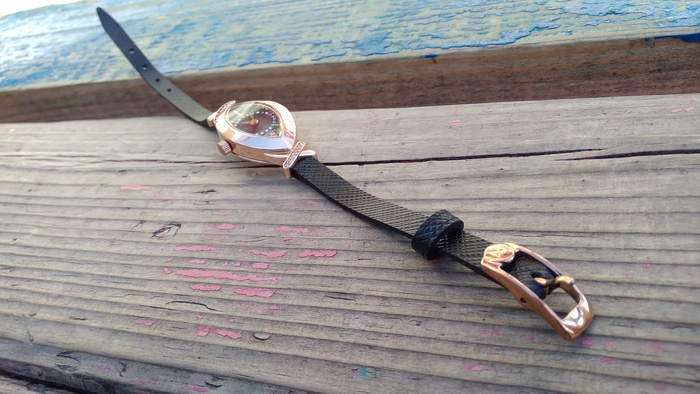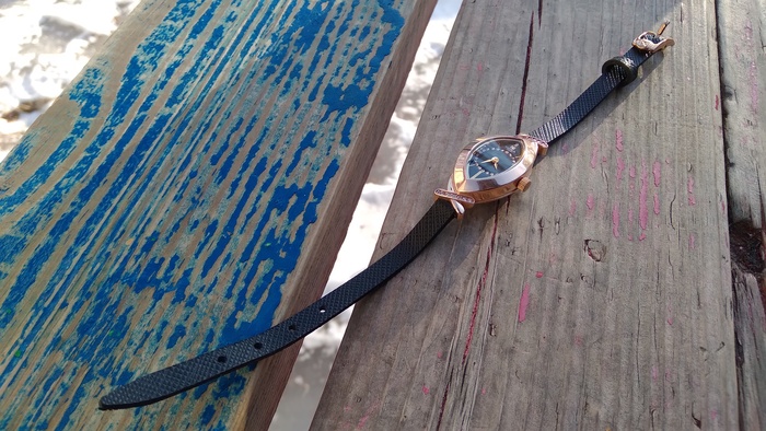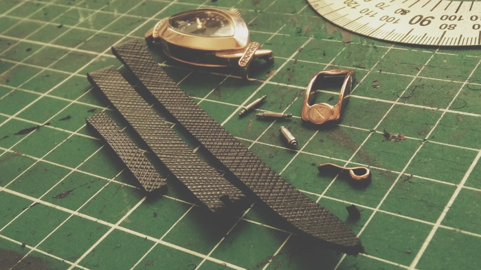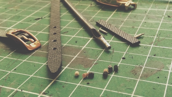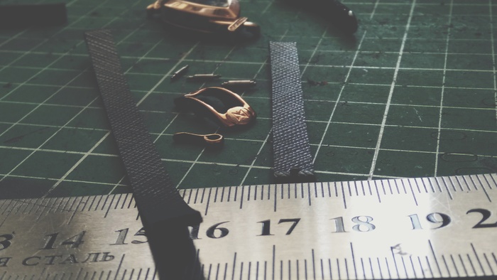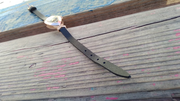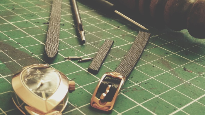 Ремешок, как ремешок, ничего сложного, кроме как крепления к часам. Надо кожу срезать очень тонко, так как расстояние - глубина посадки крепления, очень маленькая и если будет толстовато место крепления, то ремешок не получиться вставить в часы.