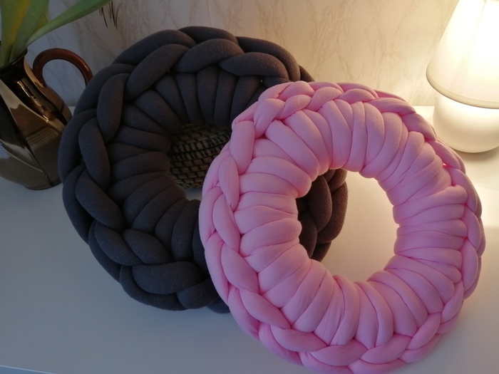 Вот заказали мне ещё связать мои подушки-зефирки. Пришлось испробовать новую пряжу vegan pipe. Она оказалась, конечно, мягкой и приятной на ощупь... Но без трикотажного эффекта. Так что имейте это ввиду. Хотя для вязания ковриков, подушек или лукошек для животных очень даже подойдёт.