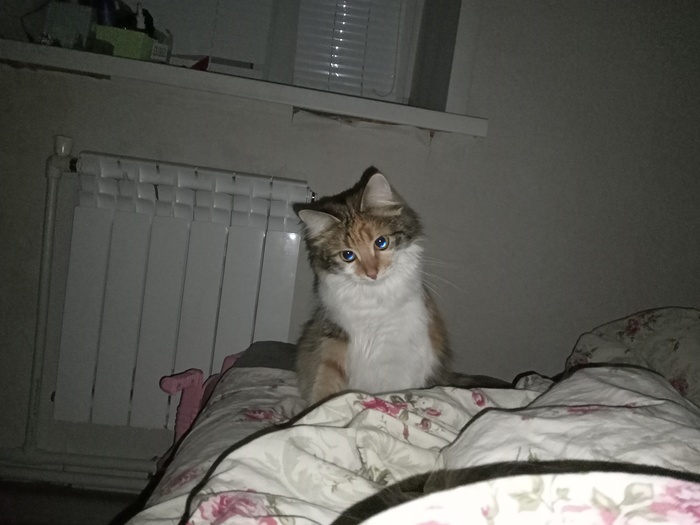 Проходит около полугода. Я временами вспоминаю нашу малышку, и задумываюсь о новом любимце (уже с полной изоляцией в доме). Но гуляя во дворе я услышала что невыносимо громко и без остановки орёт кошка. На улице зима. Прошли жёсткие холода, и мне было тяжело слушать это жалобное мяуканье. Кошка упорно мяукала во двор соседей, может просилась домой, или просто покушать. Через минуту я оказалась у ворот своего дома и позвала без конца орущую кошку к себе. Во тьме, освещаемой фонарями Я разглядела окрас, трёх цветов на шубке. В голове промелькнуло "Это девочка", и следом другая мысль "А может это моя кошечка?".