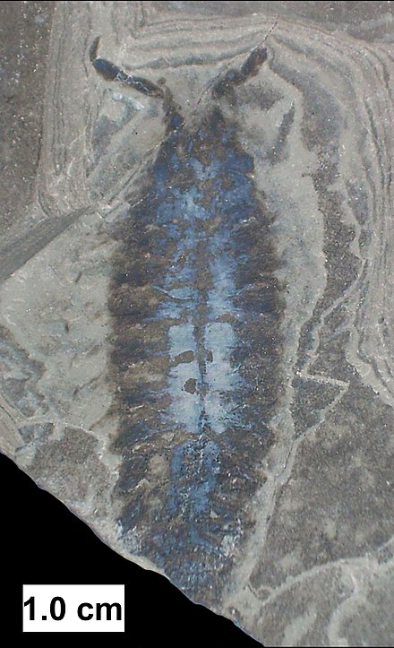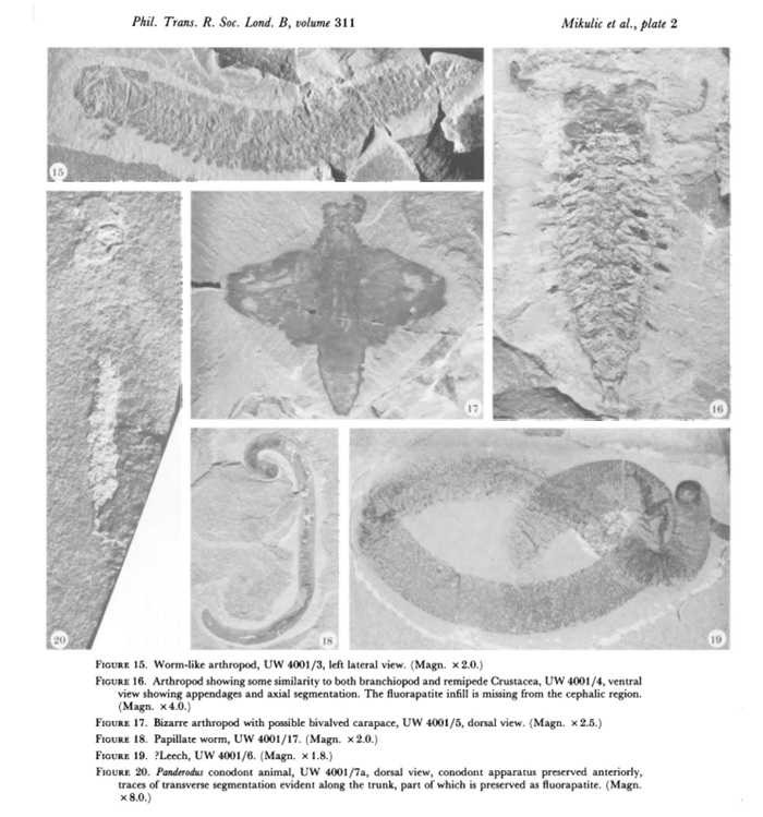Чем так известна биота Ваукеши? Да тем, что почти половина известных нам ее "узников" не имеет описания! Более того, даже описанные виды сильно отличаются от представителей других биот силура. Странные членистоногие, какие-то черви (возможные аннелиды) и, главное, бабочкоподобное создание (изображено выше), очень выделяющееся на фоне остальных находок.