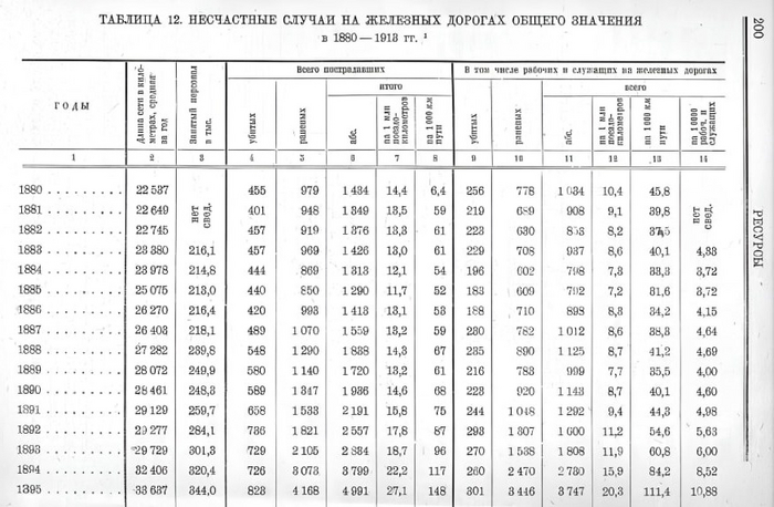 На этих табличках мы можем в очередной раз убедиться в эффективности частников и мощи Российской империи времен упадка. За 30 лет существования ЖД погибло и было ранено более 185 тысяч людей, причем очень замечателен тот факт, что из года в год, с увеличением количества железных дорог, количество жертв повышалось, и даже с учетом того, что часть информации ранее просто хуже фиксировалась, мы получаем угрожающий рост как по расчету на километр сети, так и на миллион поездо-километров.