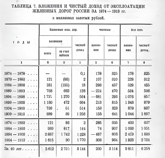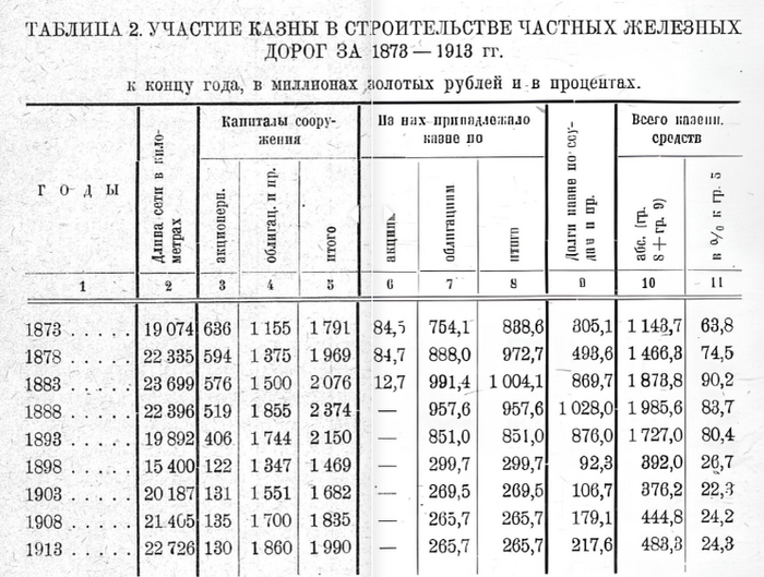 С 1870-х годов 20 века доходы железных дорог превышали сумму новых капитальных вложений, обратное только в 90-е годы, когда огромные средства были влиты в бездонный Трансиб и прочие дороги в Азии. В итоге за 40 лет вложения за счет частного (главным образом иностранного) капитала, да-да, вспоминается мантра нашего антифашистского вождя Владимира Владимировича про иностранные инвестиции, как они хороши и полезны, так вот, за 40 лет вложения этих ребят едва достигали 2 935 миллионов рублей, в то время как чистый доход измерялся в 6 258 миллионах рублей, и до последнего казенные дороги были убыточными, так как практически весь чистый доход уходил в руки уважаемых частников.
