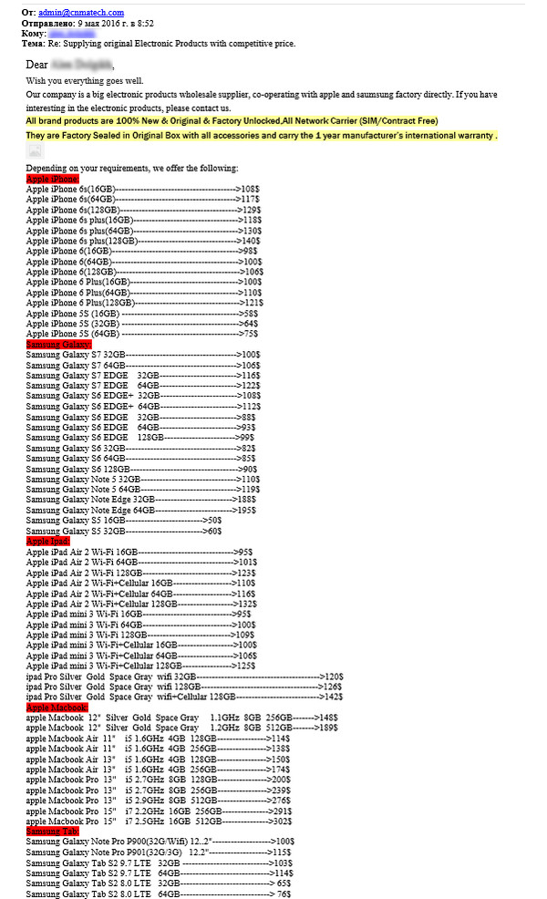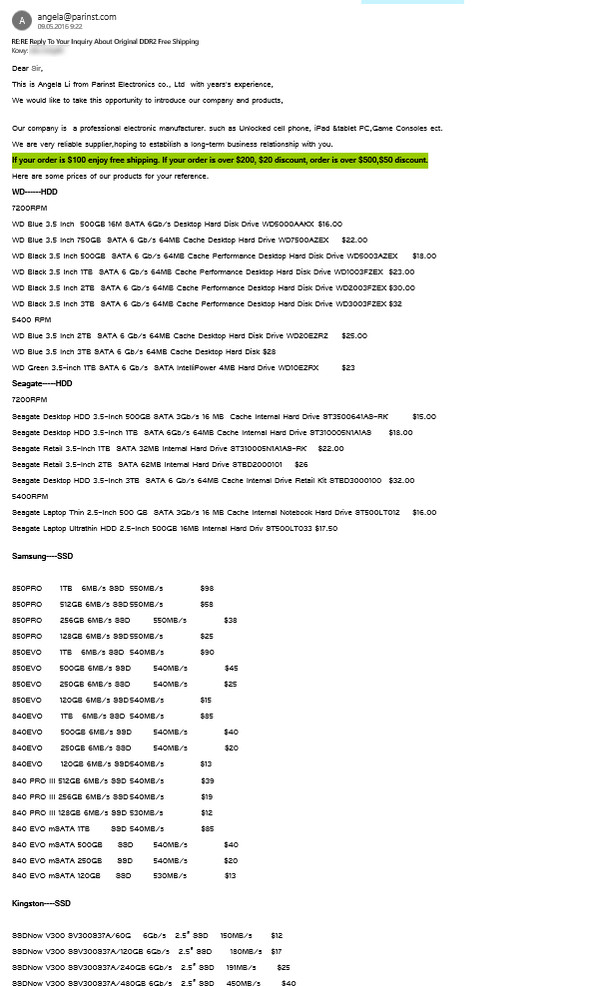 Почти все они присылают заманчивые прайсы, и хрен его разберет, насколько все соответствует действительности. Причем хитрые китайцы присылают цены не только по твоему запросу, но и "подбрасывают" в ответ интересные цены на ряд других девайсов, на что просто невозможно не обратить внимание.