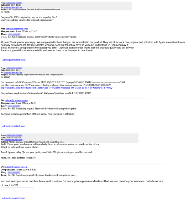 Я хотел заказать у него "на пробу" пару девайсов. Учитывая стоимость, я думал что максимум что он может сделать нехорошего - прислать мне кривые копии айфона с андроидом, и макбук с виндой и процессором Atom, коих в инете пруд пруди, хотя он уверял что это 100% оригинал, прям оригинальнее оригинала.