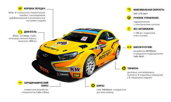 Отечественная команда ЛАДА СПОРТ РОСНЕФТЬ принимает участие на всемирных соревнованиях среди кузовных автомобилей на автомобиле LADA VESTA TC1 (LADA VESTA WTCC). У LADA VESTA WTCC характеристики превосходят предыдущею гоночную модель ЛАДА ГРАНТА WTCC. Именно поэтому команда, а особенно гонщики были рады новому автомобилю.