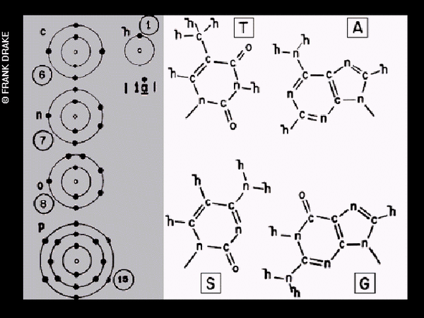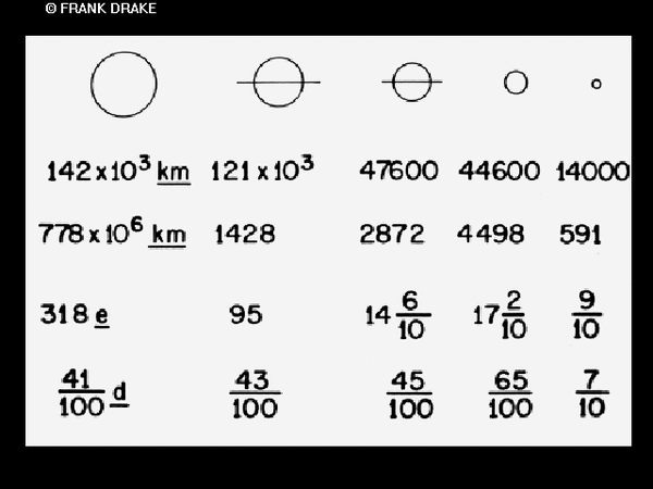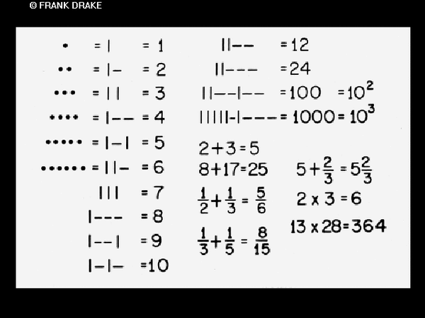 Следующие два снимка представляют собой "словарь". Цифры были определены путем соотнесения двоичных и арабских знаков и групп точек. Затем были показаны математические действия. Используя схему водорода, авторы определили единицы веса, длины и времени. Таким образом были установлены единицы, которые могут быть использованы в остальных рисунках для определения размеров и веса объектов.