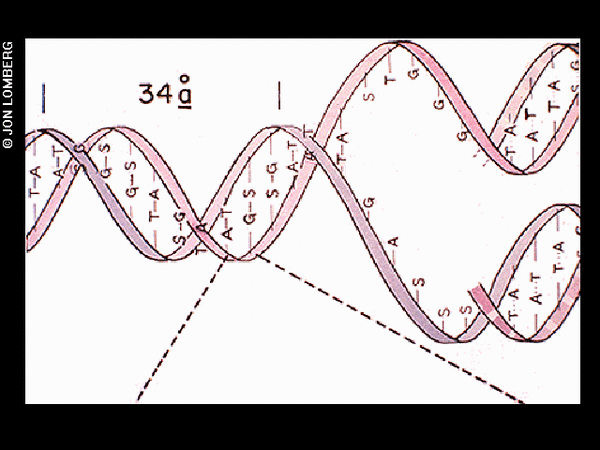 Эти же самые атомные схемы используются на следующем снимке для показа структуры и деления молекулы ДНК.