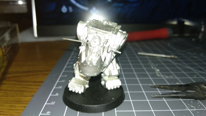 Стояла себе коробка, жрать не просила, пока меня не торкнуло в ней таки порыться. Из недр был извлечён варбосс из белого металла. С металлом я не работал, но слышал что-то про ШТИФТЫ. Благо, стальная проволока и минидрель в наличии имеется. Взяв это чудо в руки, я понял, что надфили наконец-то мне понадобились! Облой никто не отменял. Качество литья оказалось весьма так себе, не чета менгу! Ну да ладно. Где наша не пропадала!
