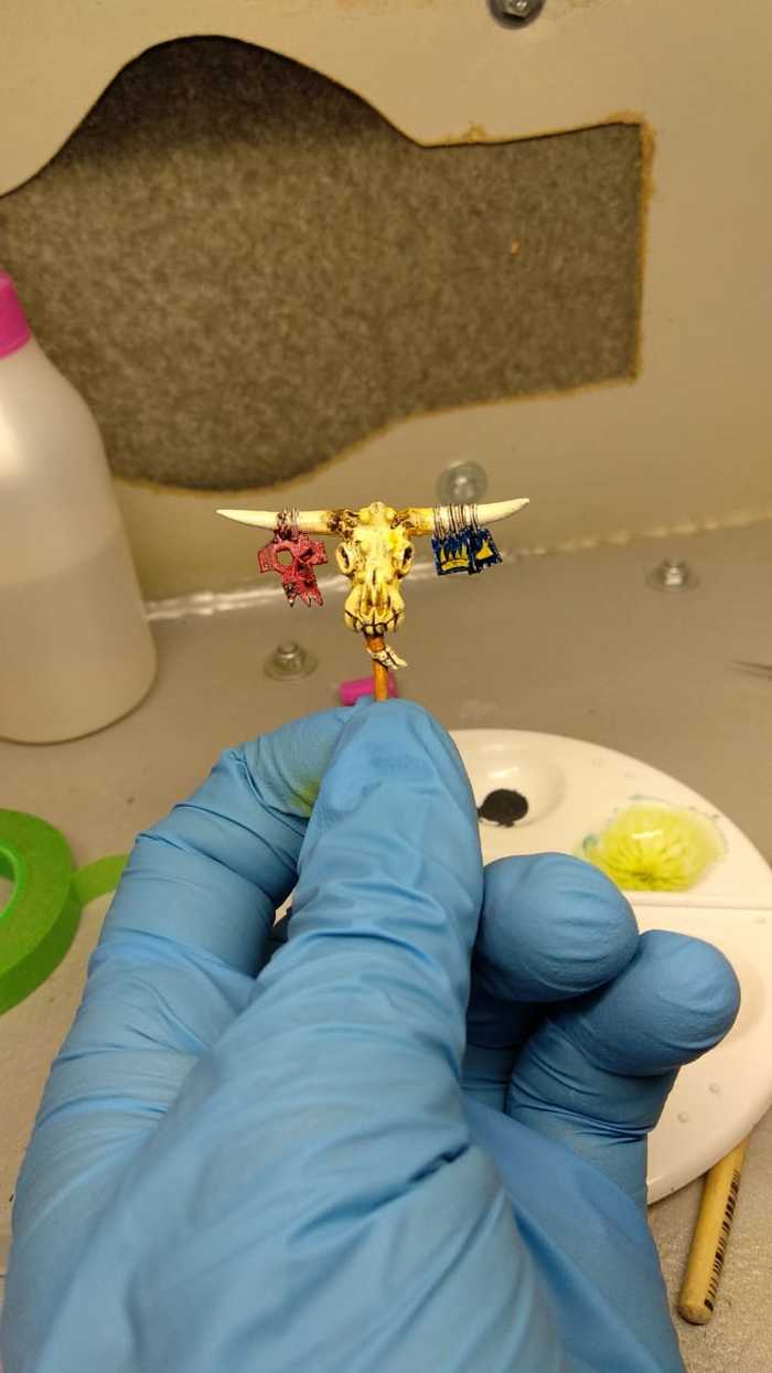 В местах сочленений высверливал отверстия, в которые вклеивал куски проволоки на суперклей. На этом этапе я их фиксировал только с одной стороны, чтобы всё можно было разобрать. Всё загрунтовал Mr.Surfaser 1200. Легло отлично. Базовую окраску я сделал полностью металликом. Он же почти весь железный! Использовал различные виды AMMO.MIG. Орочью зелень выкрасил каким-то танковым оттенком, а вот за цветом кости пришлось съездить в магазин.