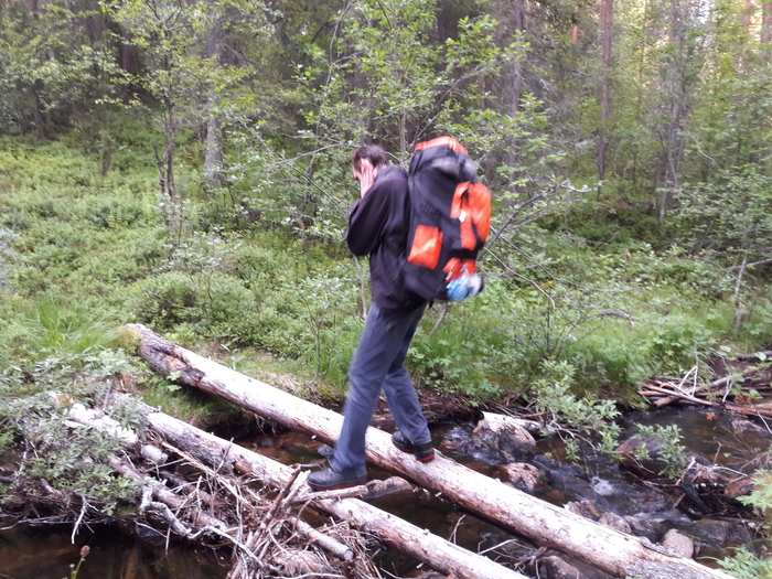 Из этих болот вниз стекают бойкие ручейки, которые тоже приходилось преодолевать. К сожалению, фотографии ручья лучше, чем эта нет. Здесь Алексей переходит через ручей по бревну и одновременно убивает какое-то назойливое насекомое.