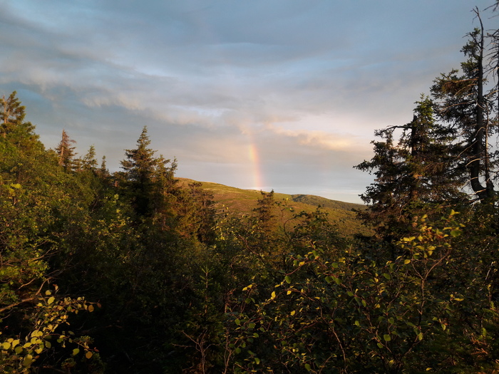 Пришлось идти в обход. Фотографий того, как мы обошли ущелье и после этого продирались через заросли и бурелом не осталось, мне в тот момент было не до съемки. Но запомнилось как по мере подъема меняются климатические зоны. Внизу растет смешанный лес, рябинки, берёзки, сосны, постепенно сосны пропадают, берёзки мельчают и остаются ёлки и можжевельник, затем ёлки сменяются берёзовыми кустами — это когда берёза вместо того чтобы расти вверх одним стволом становится похожа на куст, весьма труднопроходимые заросли оказались. Как раз когда мы до них добрались в небе появилась радуга.