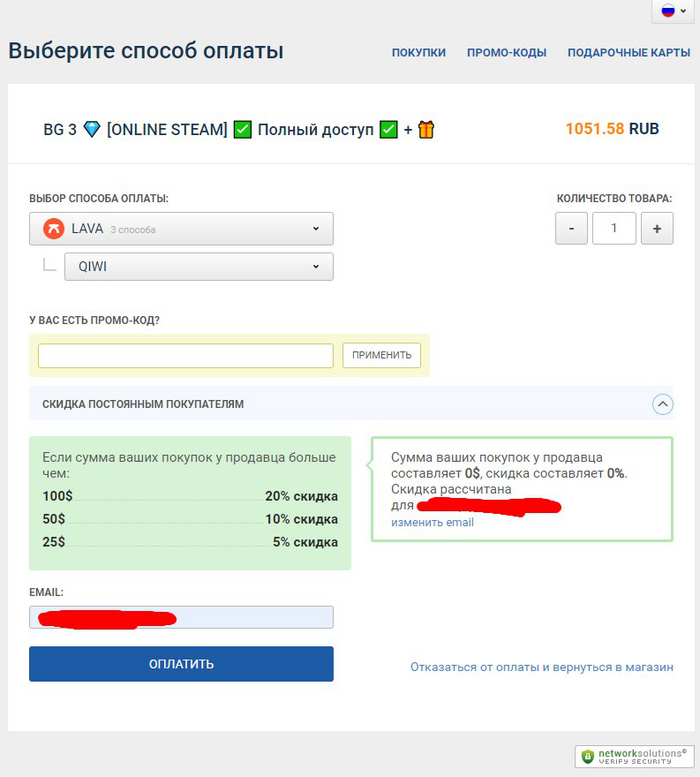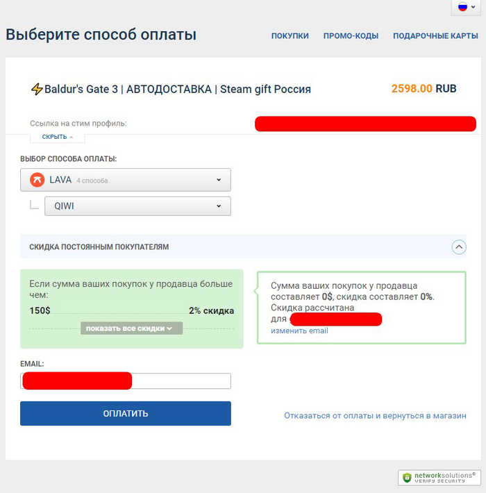 Далее нажимаем на зеленую кнопку «Оплатить» и ждем обработки платежа. Через пару минут на почту, что указывали ранее придет вся информация об оплате, а так же данные от аккаунта с игрой Baldur's Gate 3