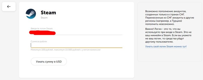 Вводим сумму пополнения и логин от своего Steam аккаунта