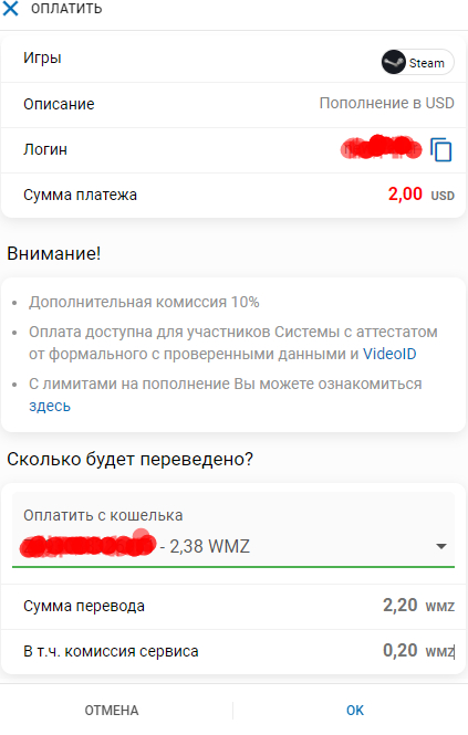 после покупки WMZ переходим к самому пополнению кошелька Steam.