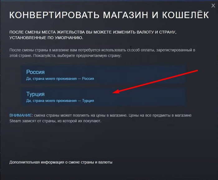 - В настройках стима выбираем Турцию (или Казахстан, так как это две страны с самым выгодным внутренним магазином игр)