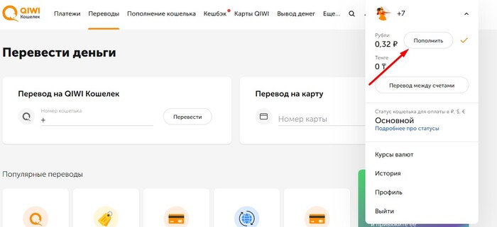Заходим на qiwi кошелек и открываем панель профиля в правом верхнем углу