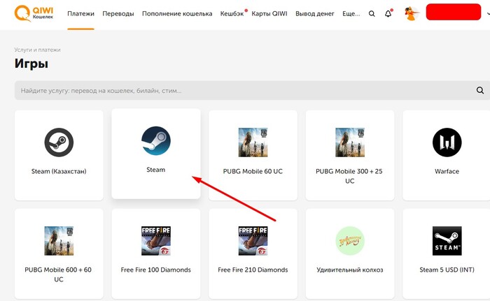 В Разделе "платежи" находим в списке вкладку "Игры", затем выбираем Steam