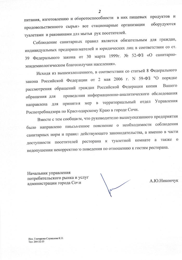 Местное подразделение РосПотребНадзора и Управление потребительского рынка администрации города Сочи прислали официальные бумаги, что «МакДоналдс» был однозначно неправ и что ему вынесено так называемое «предостережение» о недопустимости нарушения санитарных норм в дальнейшем. Ответы прилагаю.