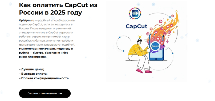 Oplatym — сервис-посредник, который помогает купить подписку CapCut Pro, если прямая оплата недоступна. Покупка оформляется через менеджера сервиса, а внутри доступны несколько вариантов подключения подписки — в зависимости от того, как вам удобнее пройти оплату и активацию Pro.