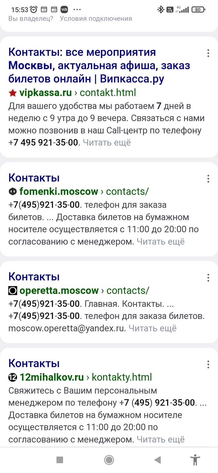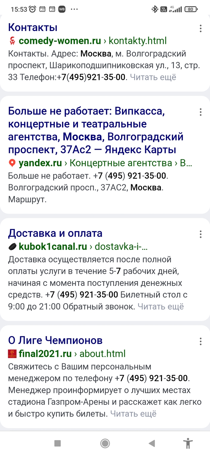 Забиваем в поиск номер телефона +7(495)-921-35-00 (телефон взят с сайта, который продал нам билеты) и находим кучу сайтов-дублеров...