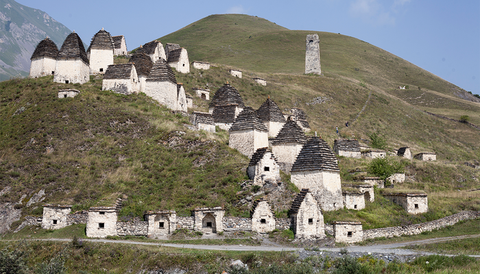 Дальше стоит завернуть в знаменитый комплекс «Город мертвых». 14-километровый горный серпантин на перевале перед въездом в Фиагдон приведет путешественника в Даргавское ущелье и село Даргавс. Тут, в долине реки Мидаграбиндон, и находится овеянный слухами городок с древними захоронениями.